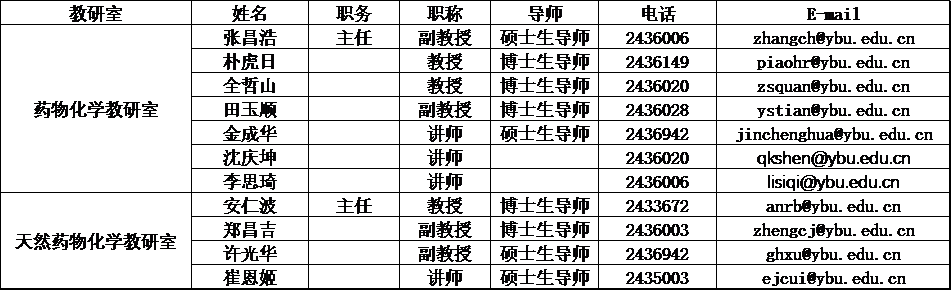 药物化学系目前共有教师11人,其中教授3人,副教授4人,高级职称占比为63.6%,博士学位占比为90.9%;博士生导师5人,硕士生导师9人。拥有吉林省有突出贡献中青年专业技术人才1人、吉林省拔尖创新人才(第一层次)1人、吉林省长白山学者特聘教授1人、吉林省高级专家1人、中西部青年骨干教师1人、搜同 图们江学者1人、青年图们江学者2人,形成一支实力雄厚、结构合理、富有创新能力和协作精神的师资队伍。