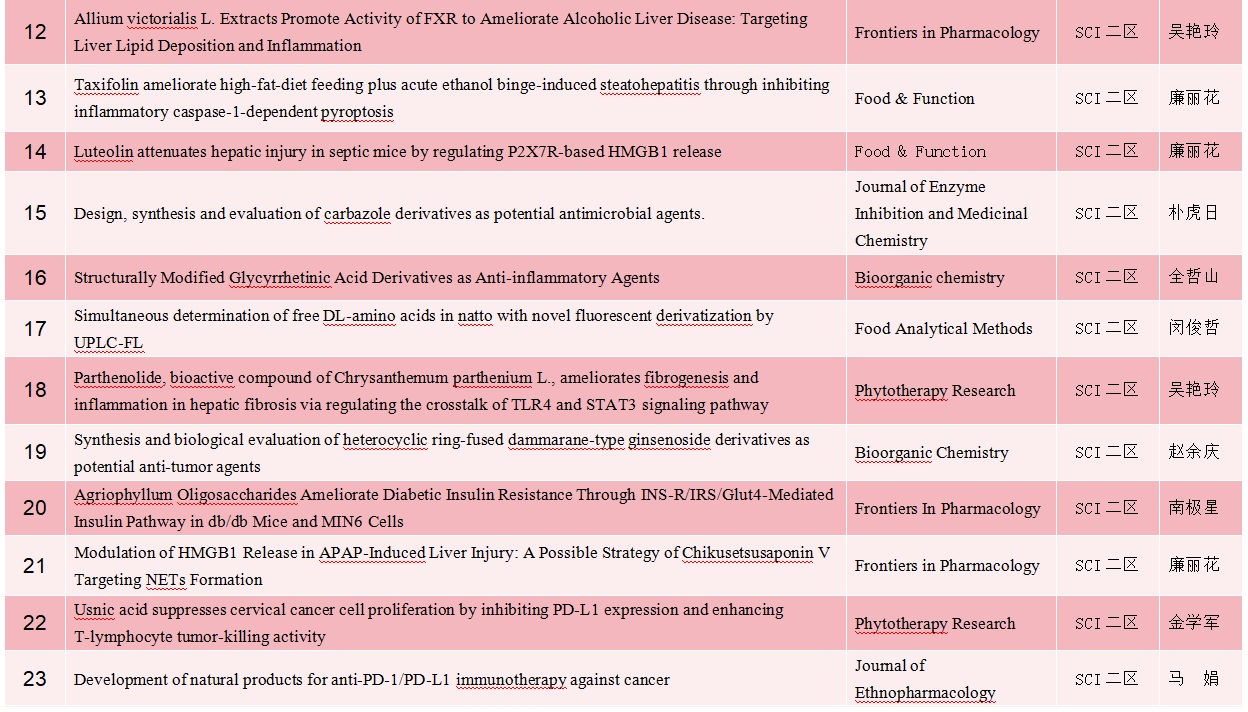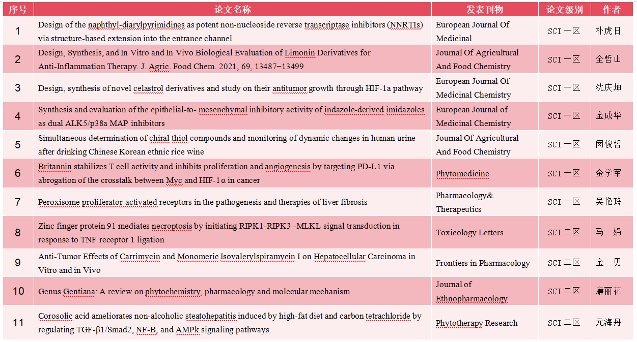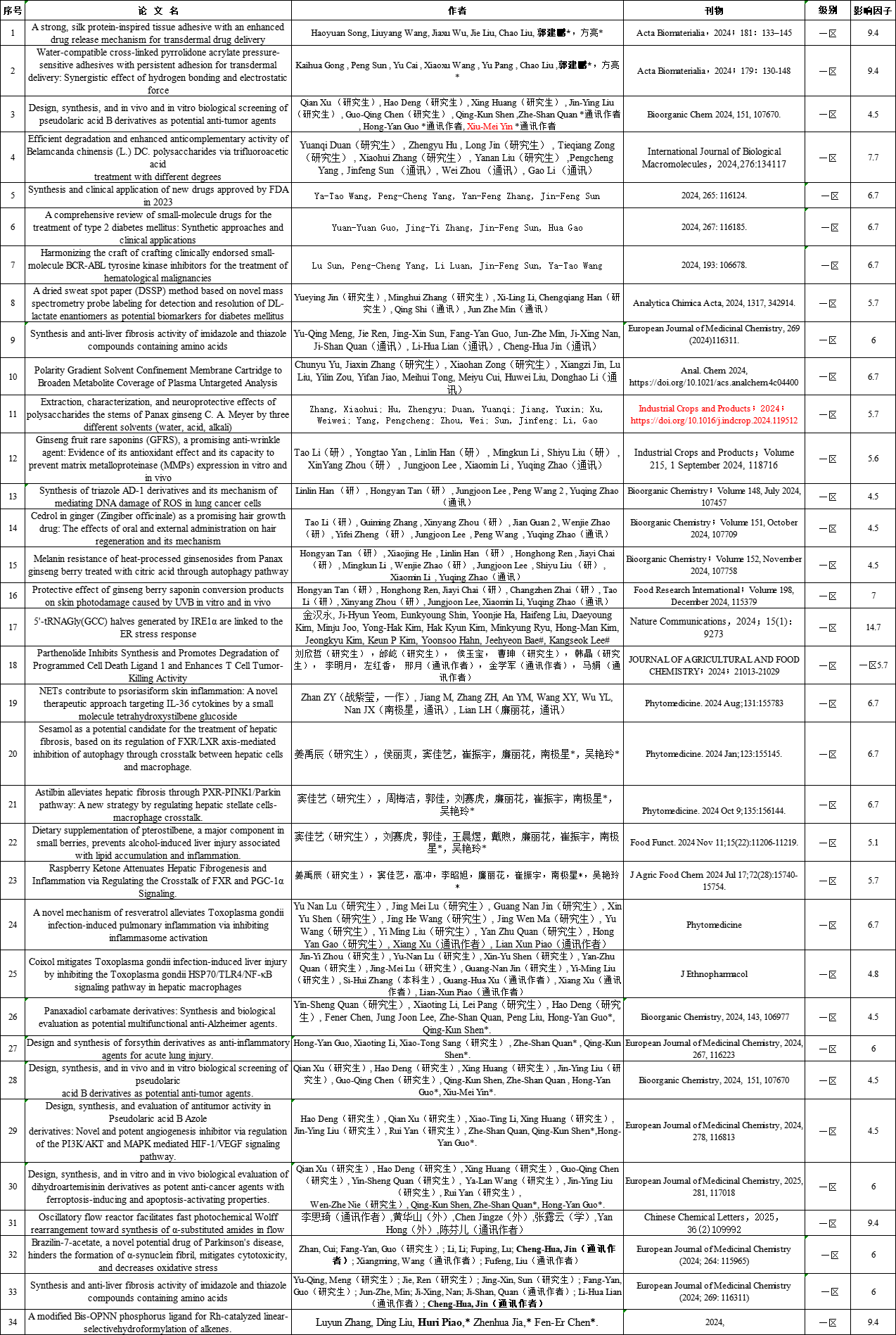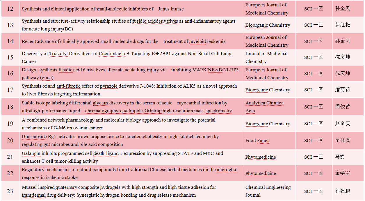 | 1 | Synthesis, in vitro and in vivo biological | 全哲山 | Acta Pharmaceutica Sinica B, 2020,10(4):628-645) | SCI 1区 |